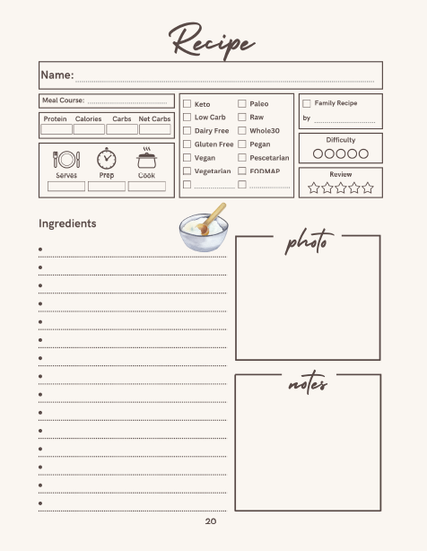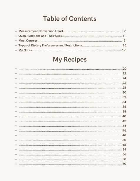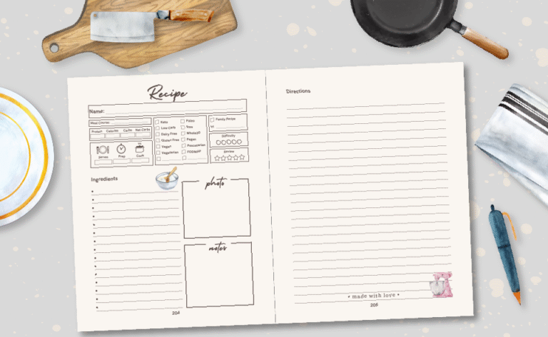Seja iniciante ou chef experiente, Recipes é o diário de receitas em branco ideal, unindo funcionalidade e beleza. Com páginas em tom creme, delicadas ilustrações em aquarela e um design acolhedor, transforma o ato de anotar receitas em um prazer.