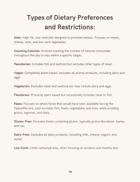 Preferências alimentares: checkboxes para vegano, keto, low carb e outras.